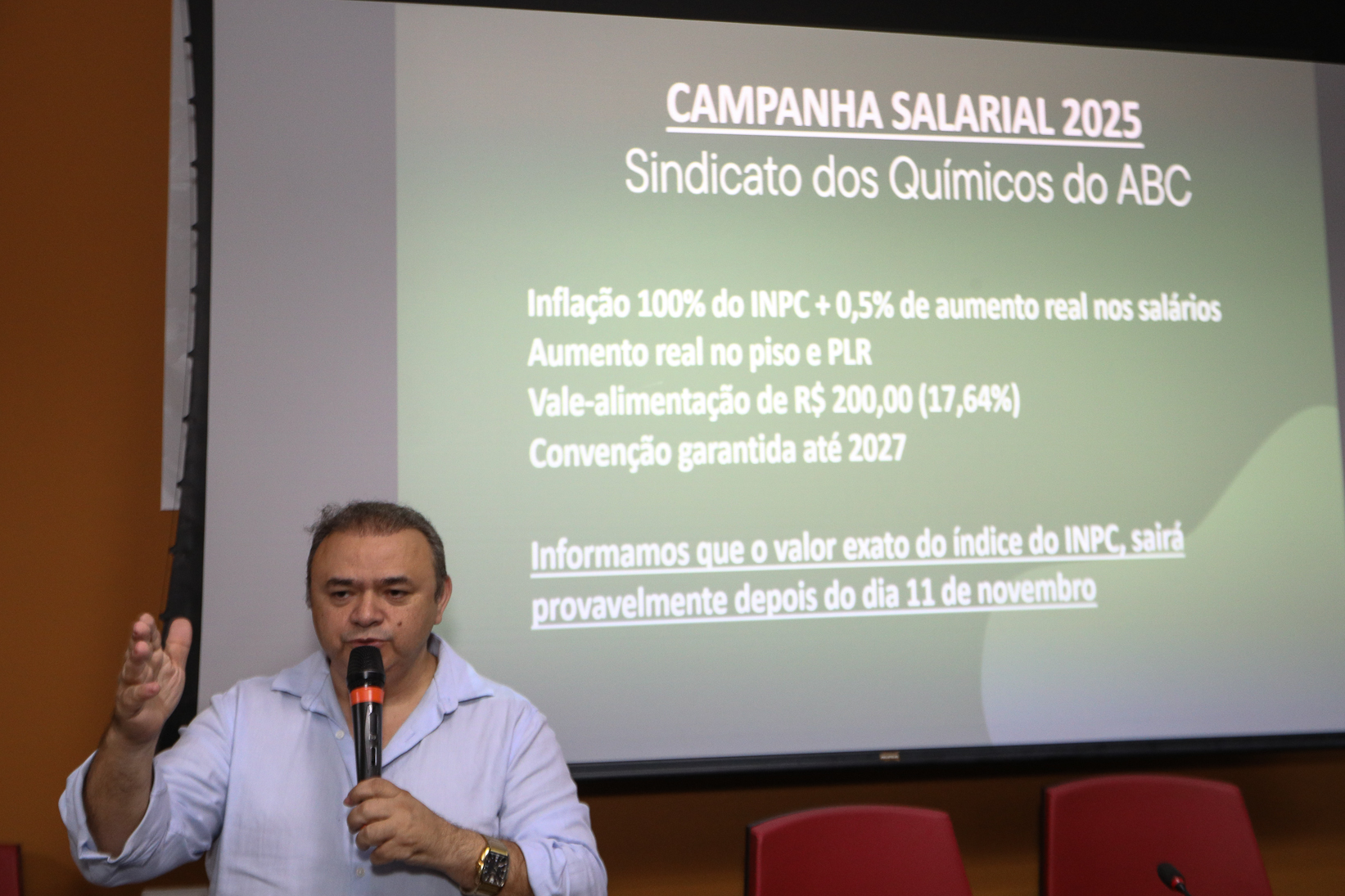 Assembleia com a categoria química do abc para apreciar a proposta da campanha salarial apresentada pela patronal na Sede do Sindicato. Rua Senador Fláquer, 813 - Centro de Santo André. Fotos Dino Santos. Brasil_07_11_2025,