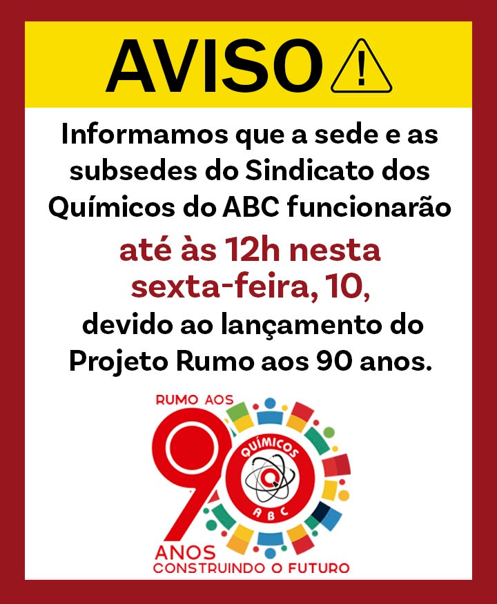 Informamos que, nesta sexta-feira, 10 de outubro, a sede e as regionais do Sindicato dos Químicos do ABC funcionarão somente até às 12h, em razão do lançamento do Projeto Rumo aos 90 Anos.